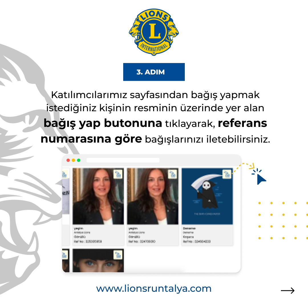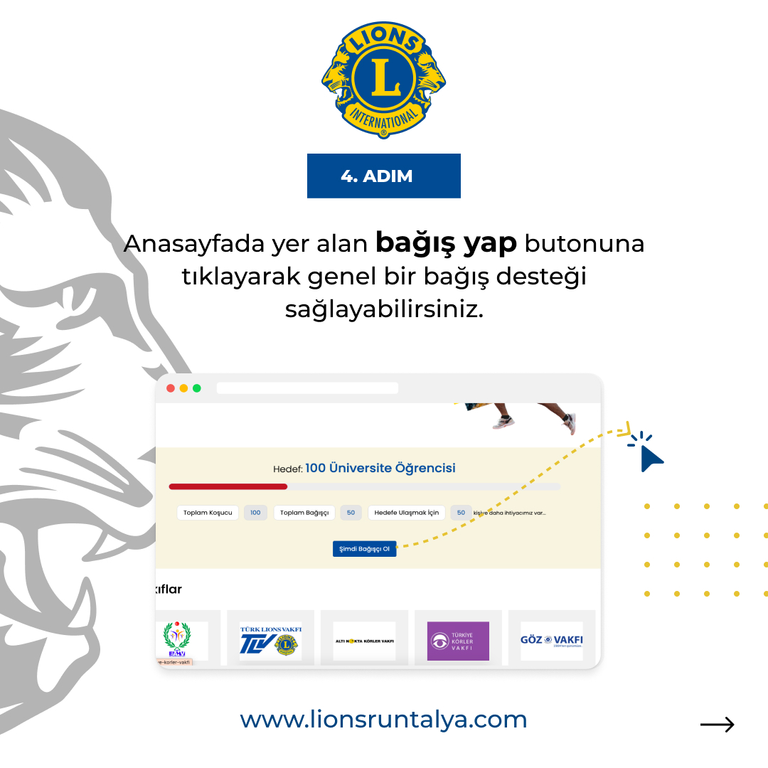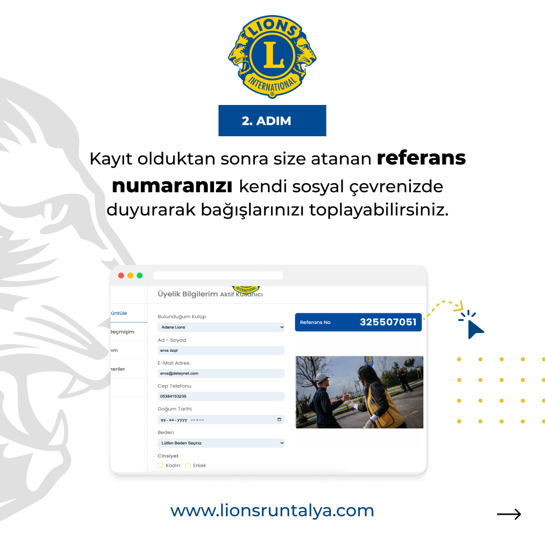 - Koşucular bağış toplayabilmek için kendi sosyal medyalarında duyurularını bireysel olarak giriş yaptıkları , lionsruntalya.com sayfasından aldıkları referans numaraları ile yapmalıdır. (Koşmanın amacı farkındalık yaratmanın yanı sıra bağış toplayabilmektir.)