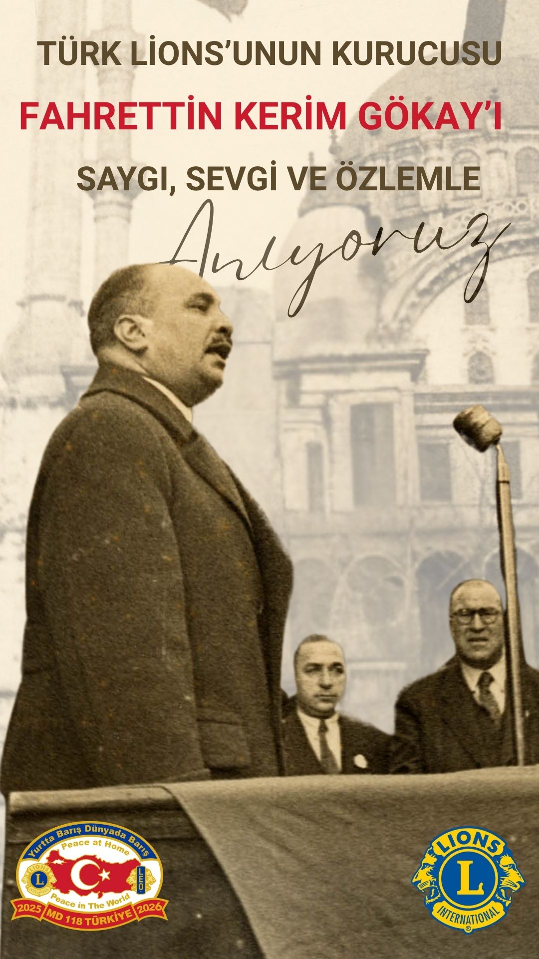 Sayın Lionlar, Sevgili Leolar ve Lion Dostları,Türk Lions’unun kurucusu, değerli devlet adamı ve ülkemizin büyük bilim insanlarından Ord. Prof. Dr. Fahrettin Kerim Gökay’ı, kurucusu olduğu 118-T Yönetim Çevresi İstanbul Milletlerarası Lions Kulübümüz ev sahipliğinde aramızdan ayrılışının 38. yılında sevgi, saygı ve minnetle anıyoruz.Bu anlamlı günde, Türk Lionsu adına Ord. Prof. Dr. Fahrettin Kerim Gökay’a olan vefamızı, hep birlikte bir kez daha göstermek için, gerçekleştirilecek anma töreninde, siz değerli Lion, Leo ve Lion Dostlarımızı da aramızda görmekten onur duyarız.Lions Anlayış, Hoşgörü ve Saygılarımla,MD 118 Konfederasyonu2025-2026 Konsey BaşkanıDr. Ender TUKAY Tarih: 22 Temmuz SalıYer: Sahrayıcedid Mezarlığı, İmam Ramiz Sokak , Sahrayıcedid , Kadıköy (lokasyon ektedir)Toplanma: 10.45Dua: 11.00Kıyafet : Konsey ve Konsey Görevlileri Resmi Kıyafet Diğer Lion, Leo ve Konuklar serbest kıyafetKonum: